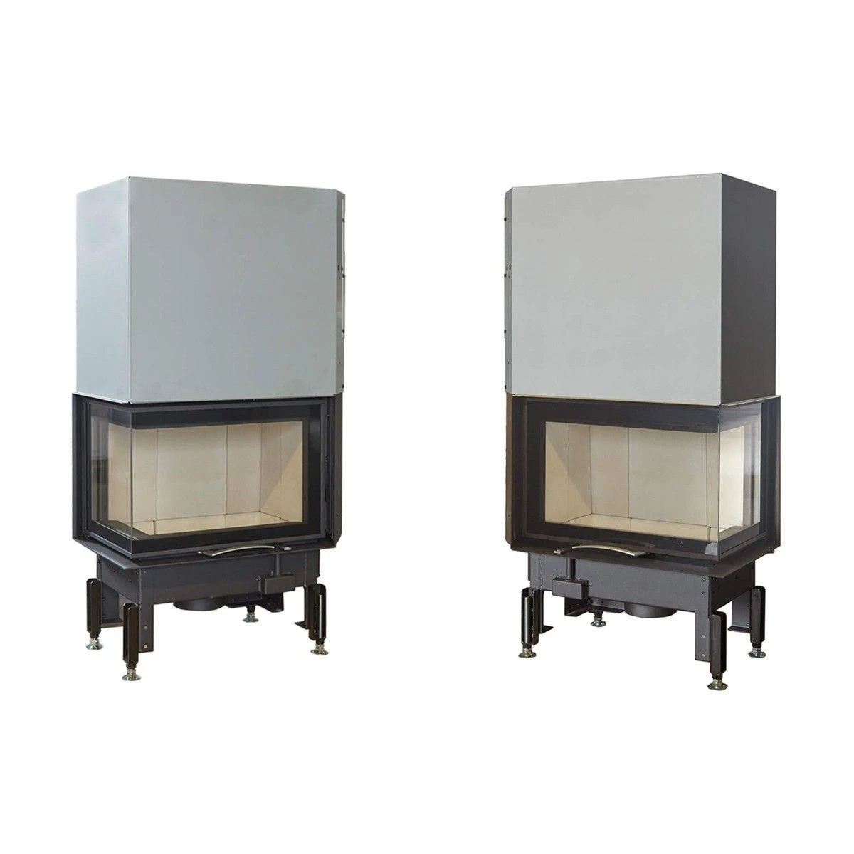 Der Austroflamm Kamineinsatz 63x40x…S 2.0 Eck RLU mit gerader Scheibe und hochschiebbarer Tür wahlweise als Eckansicht von links oder rechts in den Türhöhen 42 und 51.