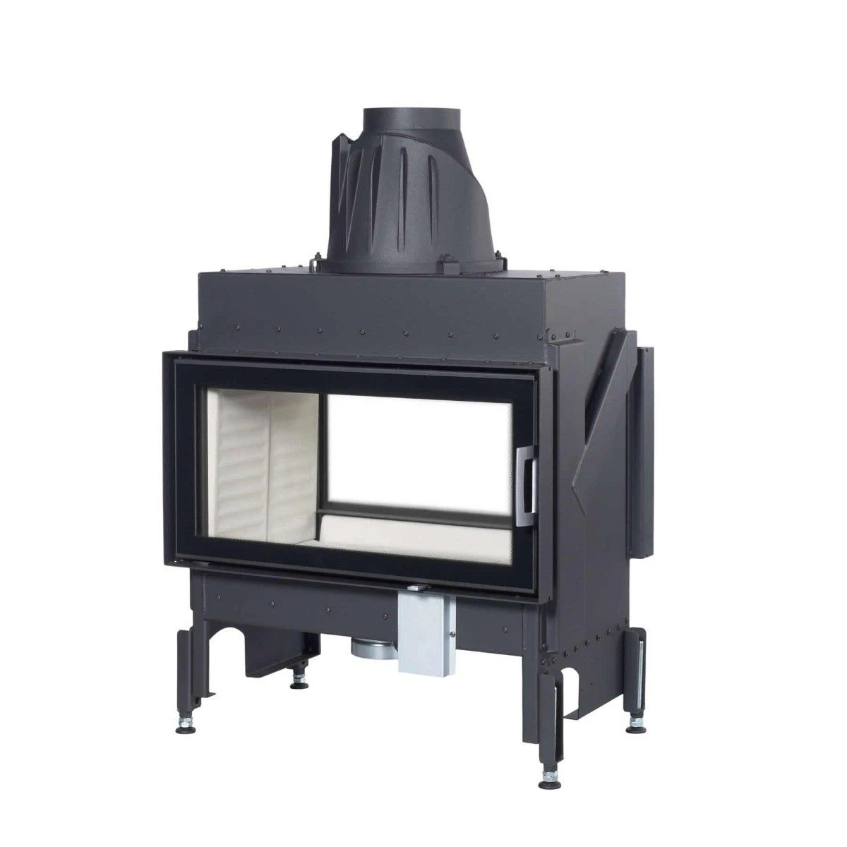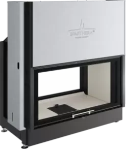 Der Austroflamm Kamineinsatz 75k II 2.0 RLU als Tunnelgerät mit gerader Scheibe, Klapptür und einer Türhöhe von 39 cm.