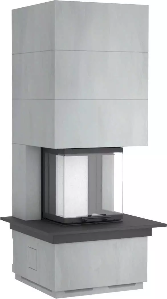 Der Kaminbausatz Speicher-Kamin Camina S12 Hoch mit Natursteinbank (mit Überstand) – 3-seitige, freistehende Kaminanlage Speicherkamin aus hochwertigen Speichermasse inkl. Kamineinsatz.