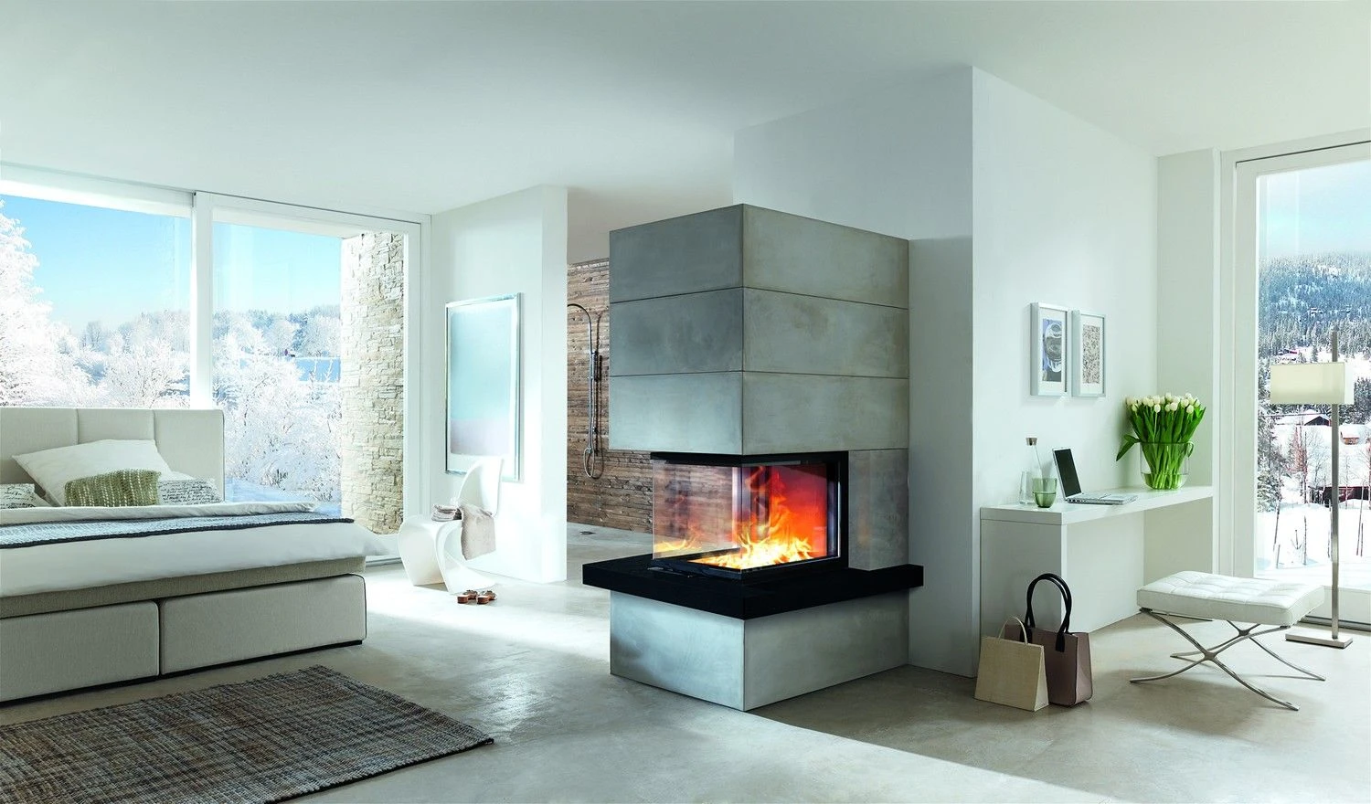 Die Camina & Schmid Kamineinsätze sind (je nach Modell)mit Schamotte glatt Weiß, Anthrazit oder Guss Anthrazit ausgestattet.